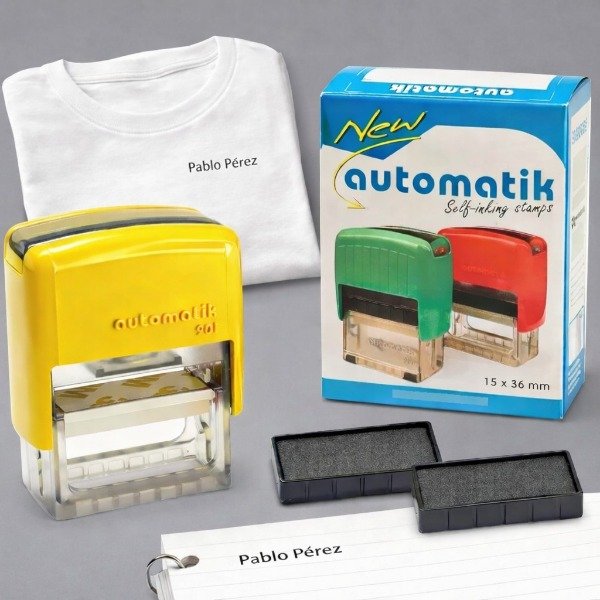 Incluye: Goma texto/escolar + tampón con tinta al agua + tampón con tinta textil